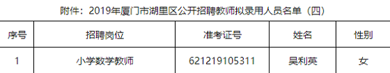附件:2019年廈門市湖里區(qū)公開招聘教師擬錄用人員名單(四)