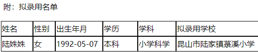 根據(jù)《2019年昆山市教育系統(tǒng)公開招聘中小學(xué)教師簡章》,陸姝姝(人員信息附后)已通過昆山市教育局組織的筆試、面試、體檢(因懷孕緩檢)和考察,現(xiàn)進行錄用公示,公示時間為2019年12月23日~12月31日。如對公示對象有異議,可在公示期間向昆山市教育局反映,聯(lián)系電話:57514790。
