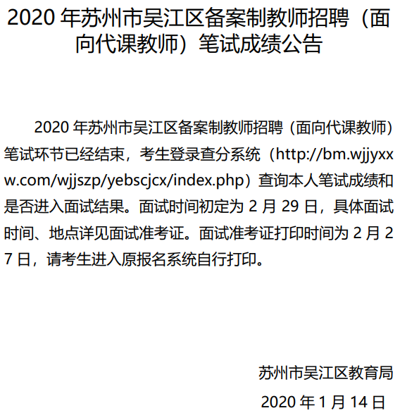 2020年蘇州市吳江區(qū)教師招聘筆試成績公告
