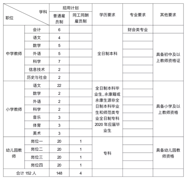 2020年我市面向社會(huì)招用普通雇員制教師148人、同工同酬學(xué)前教育雇員制教師4人;定向永康市在崗普通學(xué)前教育雇員制教師招用同工同酬學(xué)前教育雇員制教師6人,具體如下: