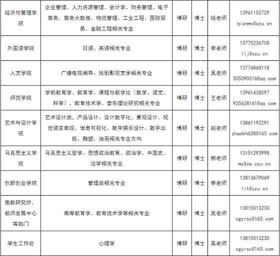有意應(yīng)聘者,請將個人簡歷、有關(guān)教學(xué)、科研業(yè)績材料及家庭情況發(fā)送至各二級學(xué)院聯(lián)系人郵箱或人事處郵箱:cgyrsc 163.com,發(fā)送主題請以"姓名+專業(yè)+學(xué)歷(職稱)+高校人才網(wǎng)"格式注明。