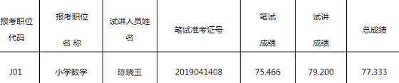 因報考2019年老城區(qū)公開招聘教師小學數(shù)學職位人員(筆試準考證號2019041203)報到后,提出自愿放棄聘用,根據(jù)《2019年老城區(qū)公開招聘教師工作實施方案》有關規(guī)定,因考生放棄空缺的職位,從報考同一職位并參加試講的人員中,按考生總成績從高分到低分的順序依次遞補。現(xiàn)將小學數(shù)學職位遞補人員名單公布如下: