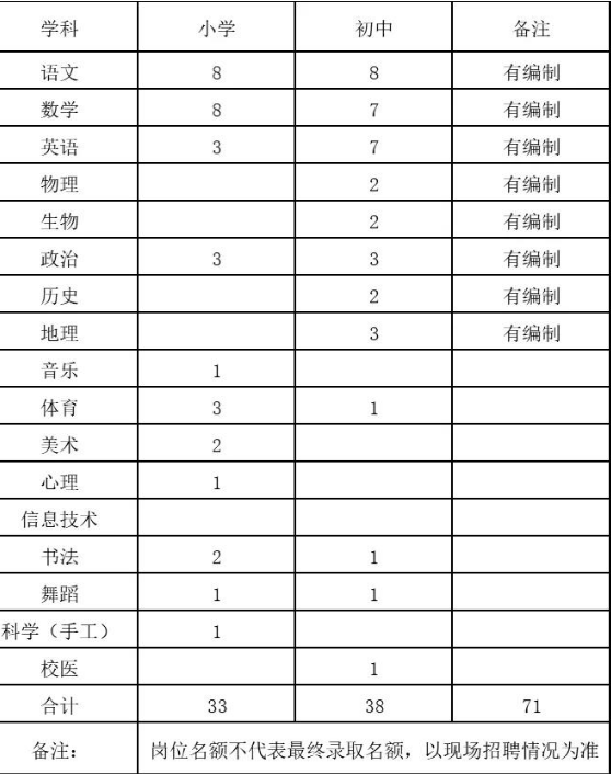 招聘教職工數(shù)量共計(jì)71名,具體招聘崗位、數(shù)量如下:
