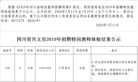 四川宜賓興文縣2019年特崗教師招聘體檢結(jié)果公示