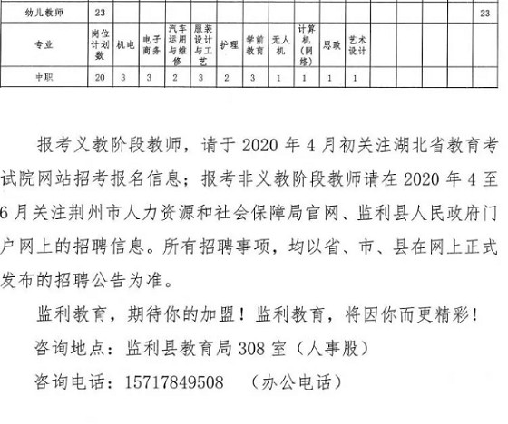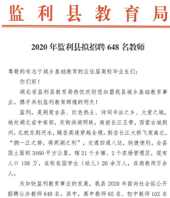 湖北教師招聘 荊州監(jiān)利縣2020年擬招聘648名教師(含崗位計(jì)劃表)