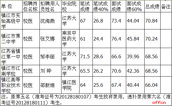 根據(jù)招聘公告有關(guān)規(guī)定,經(jīng)考試、體檢、考察后,現(xiàn)將2012年鎮(zhèn)江市市屬學(xué)校公開(kāi)招聘校醫(yī)擬錄用人員名單公示如下。公示時(shí)間從2012年9月12日至9月20日,如有異議請(qǐng)與市人社局事管處(電話:85340800)聯(lián)系。
