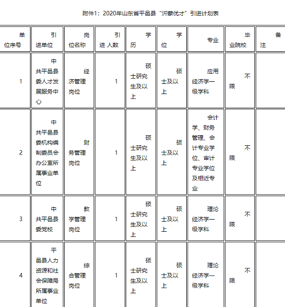 1、2020年山東省平邑縣“沂蒙優(yōu)才”引進(jìn)計(jì)劃表