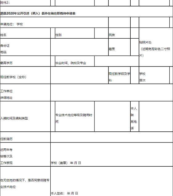 2.泗縣2020年公開(kāi)引進(jìn)(調(diào)入)縣外在編在職教師申請(qǐng)表