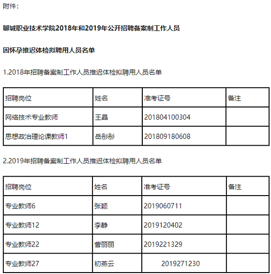 附件:聊城職業(yè)技術(shù)學(xué)院2018年、2019年公開招聘備案制工作人員因懷孕推遲體檢擬聘用人員名單。