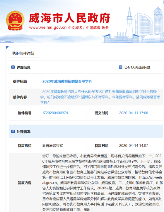 官方回復:山東威海2020年教師招聘考試擬按照學科命題