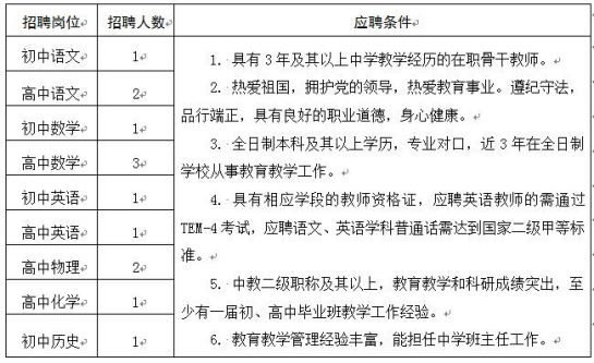 注:男教師年齡在40歲以下,女教師年齡在35歲以下。滿足以下條件之一并取得相關(guān)證件者,年齡可適當(dāng)放寬,同等條件下予以優(yōu)先考慮。