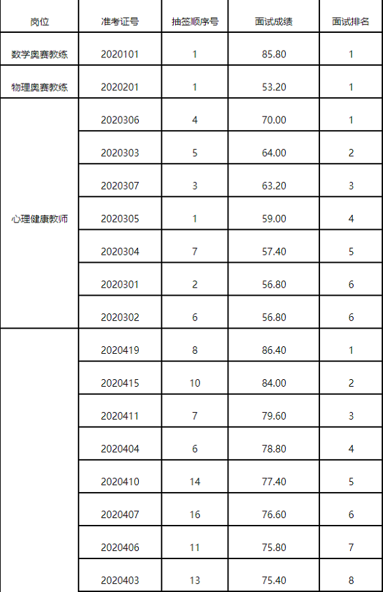 湖北教師招聘 宜昌市葛洲壩中學2020年引進急需緊缺人才面試成績公告 歡迎加入湖北教師招聘群:365239312,考情、招聘信息早知道! 根據(jù)《2020年宜昌市教育局所屬事業(yè)單位急需緊缺人才引進實施方案》和《2020年宜昌市葛洲壩中學急需緊缺人才引進面試工作方案》安排,現(xiàn)將面試成績公布如下:
