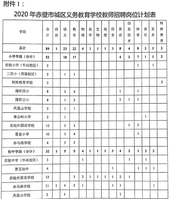 1、2020年赤壁市城區(qū)義務(wù)教育學(xué)校教師招聘崗位計(jì)劃表