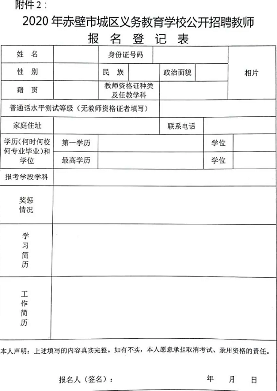 2、2020年赤壁市城區(qū)義務(wù)教育學(xué)校公開招聘教師報(bào)名登記表