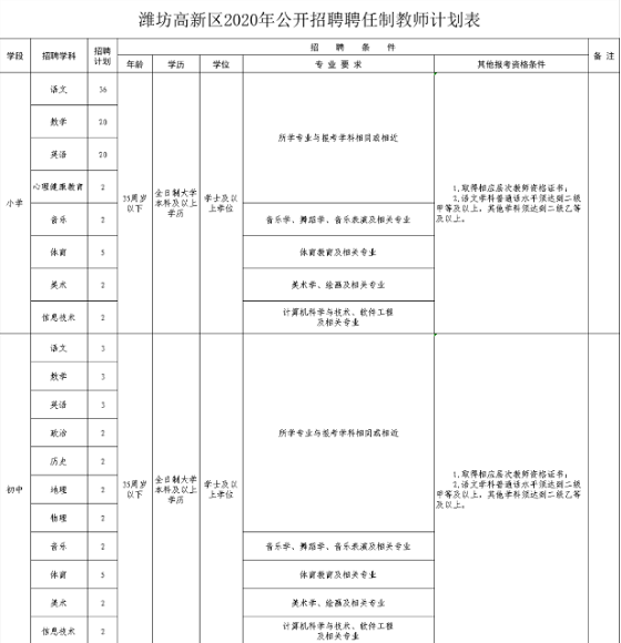 附件:濰坊高新區(qū)2020年公開招聘聘任制教師計劃表