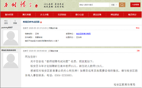 感謝您對裕安區(qū)教育事業(yè)的關心和支持!如果您還有其他需要咨詢的情況,請與裕安區(qū)教體局人事股聯(lián)系,電話:0564-3235065。