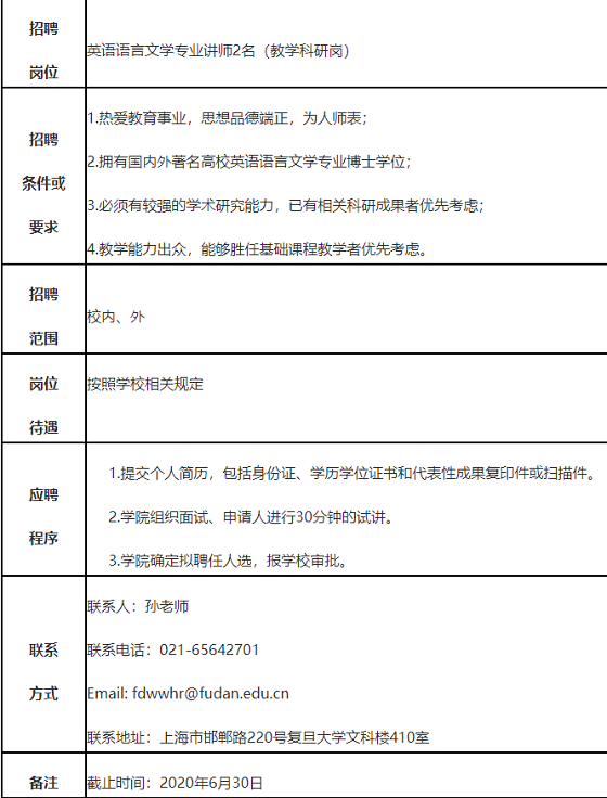 上海教師招聘 上海復(fù)旦大學(xué)外文學(xué)院2020年招聘講師公告【2名】