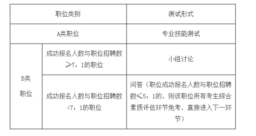 2.綜合素質(zhì)評估主要采取專業(yè)技能測試、小組討論、問答等形式,對考生進(jìn)行考察。各職位具體考核形式見下表。