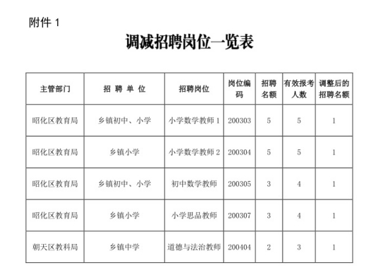 一、根據報名情況,有5個崗位將調減招聘名額,共調減招聘名額13個(見附件1);有4個崗位將取消招聘,共取消招聘額6個(見附件2)。