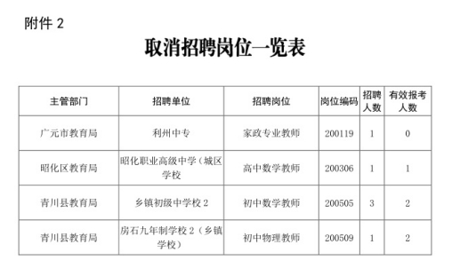 根據《四川省事業(yè)單位工作人員招聘工作試行辦法》(川人發(fā)〔2006〕9號)和《廣元市人力資源和社會保障局關于廣元市2020年上半年面向社會公開考試招聘事業(yè)單位工作人員的公告》規(guī)定,本次公開招聘開考比例為有效報考人數與招聘崗位招聘人數之比不低于3:1,未達到此比例的,調減該崗位招聘名額或取消該招聘崗位,F將調整部分招聘崗位情況公告如下。