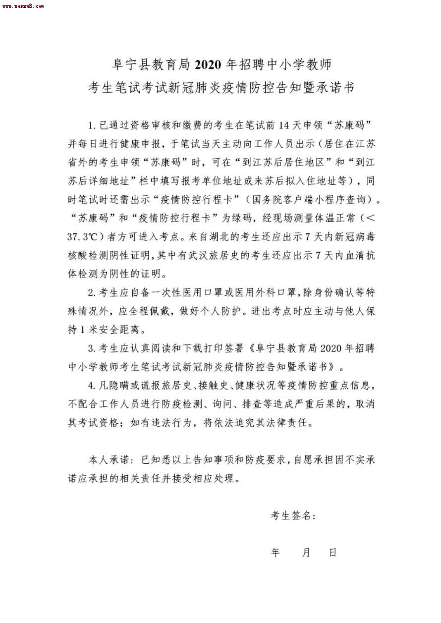 4.考生應(yīng)認(rèn)真閱讀和下載打印簽署《阜寧縣教育局2020年招聘中小學(xué)教師考生筆試考試新冠肺炎疫情防控告知暨承諾書》,在進(jìn)入考場(chǎng)時(shí)交給監(jiān)考人員。