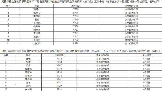 無錫市錫山區(qū)教育系統(tǒng)面向2020屆普通高校畢業(yè)生公開招聘事業(yè)編制教師(第二批)體檢遞補考生公告