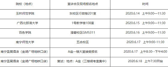 1.現(xiàn)場宣講和動(dòng)員。我縣將于2020年6月14日至18日派出招聘小組赴玉林師范學(xué)院、廣西北部灣大學(xué)(原欽州學(xué)院)、百色學(xué)院和南寧師范大學(xué)(原廣西師范學(xué)院)(具體地點(diǎn)及時(shí)間見下表)進(jìn)行宣傳動(dòng)員。