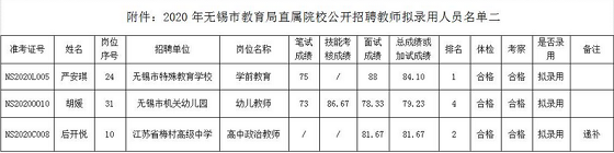 2020年無錫教師招聘 無錫市教育局直屬院校公開招聘教師擬錄用人員名單公示二