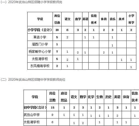 根據(jù)農(nóng)村學校編制、崗位空缺情況及教育教學需要,2020年武當山特區(qū)面向社會公開招聘農(nóng)村義務教育學校非新機制教師35名,招聘崗位及數(shù)量情況如下: