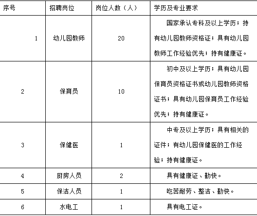 2.報考幼兒園教師職位的具有幼兒園教師資格證書(2018至2020年未落實工作的畢業(yè)生可“先上崗、后考證”,上崗一年內(nèi)考取資格證);保育員、保健醫(yī)具有相關(guān)證書。