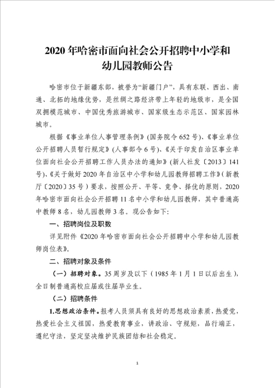 2020年新疆哈密市面向社會公開招聘中小學(xué)和幼兒園教師公告【11人】