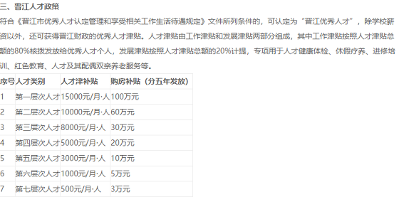 2、符合“泉州市高層次人才”和“晉江市優(yōu)秀人才”等各類人才申報(bào)條件的優(yōu)秀人才,學(xué)校給予支持推薦申報(bào),入選后可享受相應(yīng)人才津貼及購房補(bǔ)貼;