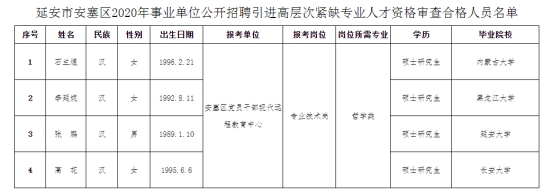 附件:延安市安塞區(qū)2020年事業(yè)單位公開(kāi)招聘引進(jìn)高層次緊缺專(zhuān)業(yè)人才資格審查合格人員名單