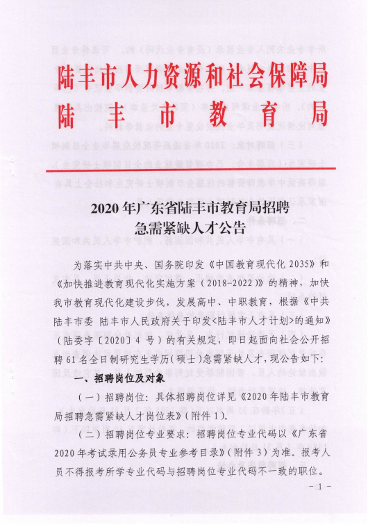 2020年廣東汕尾陸豐市教育局招聘急需緊缺人才公告【61人】