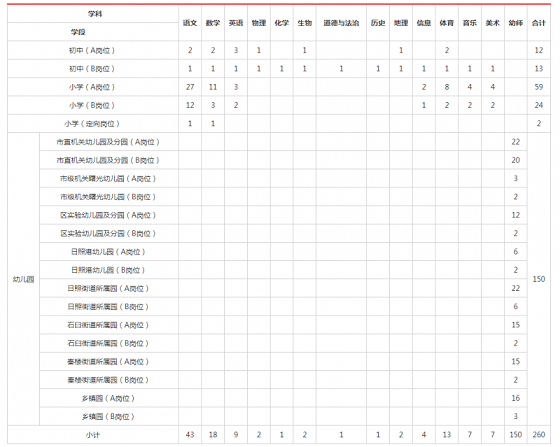 本次計(jì)劃招聘教師260名,其中初中教師25名、小學(xué)教師85名、幼兒園教師150名。具體招聘崗位、人數(shù)見下表。