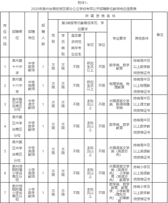 附件:1.2020年泉州臺商投資區(qū)部分公立學校專項公開招聘新任教師崗位信息表