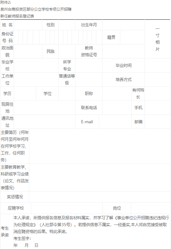 2.泉州臺商投資區(qū)部分公立學校專項公開招聘新任教師報名登記表