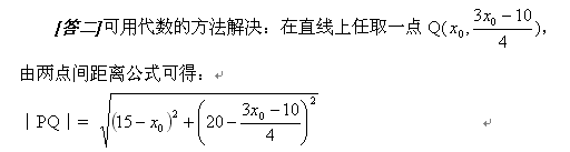 [答三]要求點P到直線上的點的最短距離,即求點P到直線的距離,由點到直線距離的概念,直接過點P作PQ垂直于直線于Q點,則線段PQ的長即為所求。(如圖4—2所示)