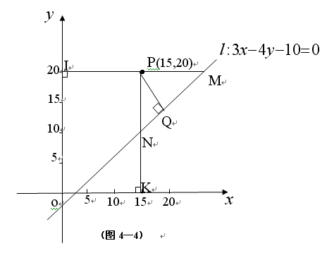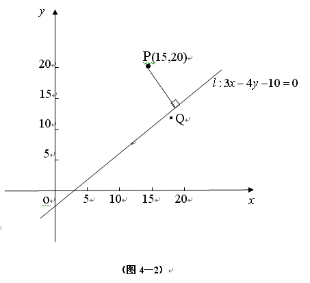 實例:某供電局計劃年底解決本地區(qū)最后一個村莊的用電問題,經(jīng)過測量,若按部門內部設計的坐標圖(即以供電局為直角坐標原點,正東方向為x軸的正半軸,正北方向為y軸的正半軸,長度單位為千米),得知這個村莊的坐標是(15,20),離它最近的只有一條直線線路通過,其方程為:3x–4y–10=0,問要完成任務,至少需要多長的電線?(如圖4—1所示)