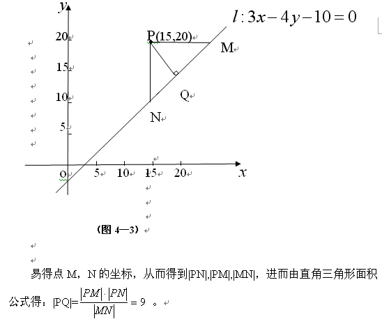過P作PQ垂直于直線于Q點,則PQ即為所求,再過點P分別作軸、軸的平行線分別交直線于M,N點(如圖4—3所示)