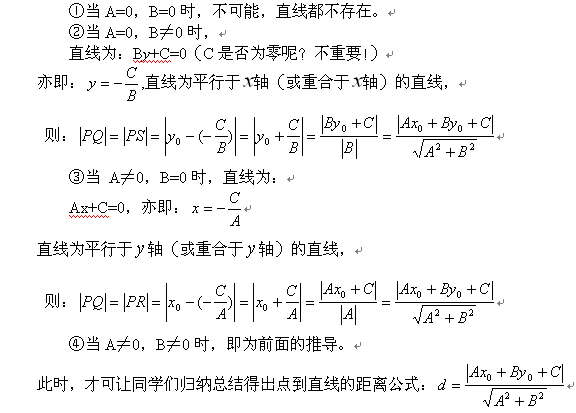 [師講]通過前面[答二]、[答三]、[答四],我們都遇到了同一個攔路虎,即運算量較大的問題,而我們今后將會遇到大量的類似問題,如果都如此運算,未免太浪費寶貴的時間。此時此刻,我們多么需要有一個簡便的運算點到直線的距離的公式來解救我們!