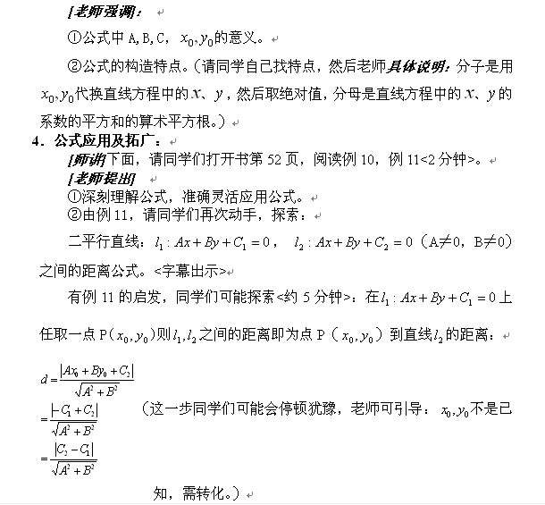 出于簡潔性的考慮,教材編寫單刀直入地直接提出核心問題,并給予解決的方法。我編寫本節(jié)教案時,通過創(chuàng)設問題情境引入課題,降低難度,教給學生從特殊到一般的研究問題的方法和策略,激發(fā)學生去解決問題,探究問題,得出結論。在這個過程中,老師作適當?shù)狞c撥、引導,讓學生逐步逼近目標,充分展示數(shù)學知識產(chǎn)生的思維過程,讓學生均能自覺主動地參與進來。教師的主導作用,學生的主體地位都得以充分體現(xiàn),然后讓學生自己歸納、總結得出結論,享受成功的喜悅和快樂。對教材上的例10、例11,由于是直接應用點到直線的距離公式,較易,故我讓學生直接去閱讀、去理解,熟悉點到直線的距離公式。但對例11的稍許變化,卻抓住不放,通過例11的解法的啟示,激發(fā)學生進一步去應用點到直線的距離公式去探究二平行直線間的距離公式,利用有限的時間和學生剛成功的那一股學習的慣性,對教材進行拓廣,讓學生對歸納總結出的公式有更加深刻、透徹的理解和掌握,達到靈活應用的目的。