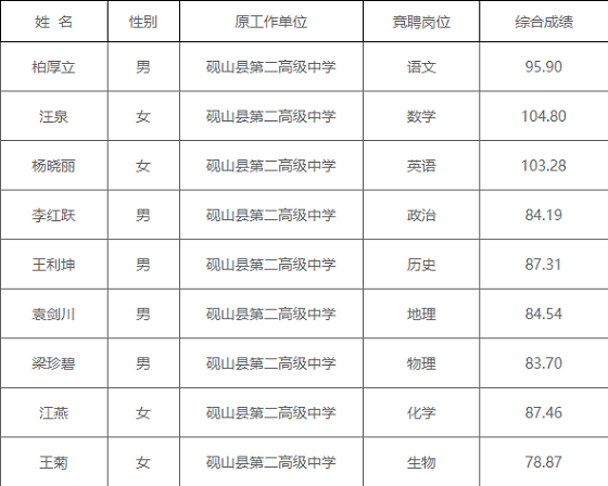 根據(jù)《硯山縣民族中學(xué)2020年面向硯山縣第二高級(jí)中學(xué)公開選調(diào)在職在編高中教師公告》的相關(guān)要求,在縣教育體育局的指導(dǎo)和學(xué)校監(jiān)督組的監(jiān)督下,我校于2020年7月11日至12日組織報(bào)名參加競聘的教師進(jìn)行語文、數(shù)學(xué)、英語、政治、歷史、地理、物理、化學(xué)、生物九個(gè)專業(yè)的筆試、面試考核,根據(jù)選調(diào)公告和應(yīng)聘者綜合成績及擬聘人員體檢報(bào)告,擬對(duì)下列人員進(jìn)行聘用: