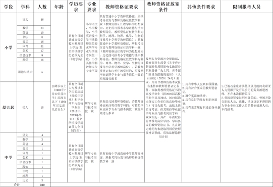 2.小學(xué)教師:具有全日制普通高等學(xué)校本科及以上學(xué)歷(報(bào)名所填報(bào)學(xué)歷必須為全日制學(xué)歷),小學(xué)語(yǔ)文、小學(xué)數(shù)學(xué)、小學(xué)英語(yǔ)及小學(xué)書(shū)法教師崗位要求所學(xué)專(zhuān)業(yè)與所報(bào)考崗位一致,小學(xué)其他學(xué)科教師崗位專(zhuān)業(yè)不限;具有普通中小學(xué)教師資格證,所報(bào)考崗位需與教師資格證任教學(xué)科一致(教師資格證任教學(xué)科為思想政治、歷史的可報(bào)考小學(xué)道德與法治教師崗位;教師資格證任教學(xué)科為科學(xué)、地理、物理、化學(xué)、生物的可報(bào)考小學(xué)科學(xué)教師崗位),若教師資格證未注明任教學(xué)科的,可按照畢業(yè)證所學(xué)專(zhuān)業(yè)與報(bào)考崗位一致的原則進(jìn)行報(bào)名。