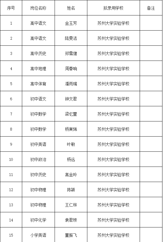 根據(jù)《2020年蘇州大學(xué)實(shí)驗(yàn)學(xué)校招聘年金制教師簡(jiǎn)章》規(guī)定,經(jīng)公開(kāi)報(bào)名、筆試、面試、政審、體檢等程序,擬錄用以下15名同志為相城區(qū)年金制教師,現(xiàn)予以公示,公示時(shí)間為7個(gè)工作日(7月23日—7月31日)。
