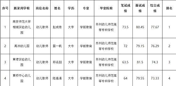 根據(jù)《2020年蘇州市相城區(qū)定向招聘免費(fèi)幼兒師范男生簡章》規(guī)定,經(jīng)報(bào)名、筆試、面試、體檢、政審等程序,擬錄用以下4名同志,現(xiàn)予以公示,公示時(shí)間為7個(gè)工作日(7月27日—8月4日)。