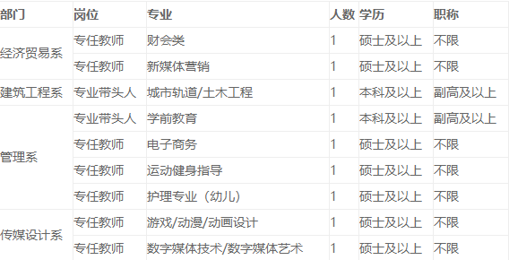 專任教師:碩士及以上學(xué)歷(學(xué)位),重點(diǎn)院校的優(yōu)秀畢業(yè)生可適當(dāng)放寬學(xué)歷(學(xué)位)要求,專業(yè)對(duì)口或相關(guān)專業(yè),有職稱、教學(xué)經(jīng)驗(yàn)和企業(yè)實(shí)踐經(jīng)驗(yàn)者優(yōu)先錄用。