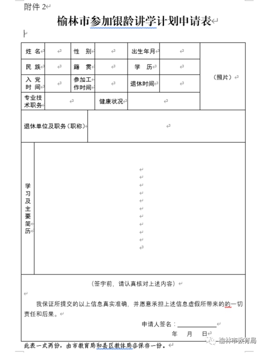 (二)現(xiàn)場報(bào)名。即日起至8月15日為報(bào)名時間。自愿報(bào)名的退休教師持本人身份證、任職資格證書、《銀齡講學(xué)計(jì)劃教師申請表》(一式兩份)(見附件2,可在榆林教育網(wǎng)下載申請表,網(wǎng)址:http://61.134.62.12:809/Pages/news_37100.html)到有關(guān)縣區(qū)教體局報(bào)名。