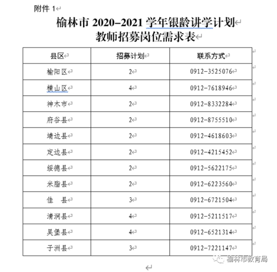 全市計(jì)劃招募銀齡講學(xué)教師32名。具體崗位詳見《榆林市2020-2021學(xué)年銀齡講學(xué)計(jì)劃招募崗位需求表》(附件1)。