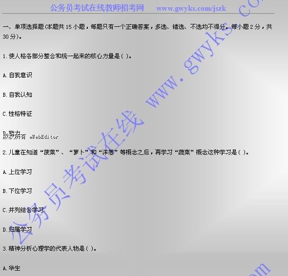 3.C[解析]弗洛伊德是奧地利精神病醫(yī)生及精神分析學(xué)家,是精神分析心理學(xué)的代表人物。